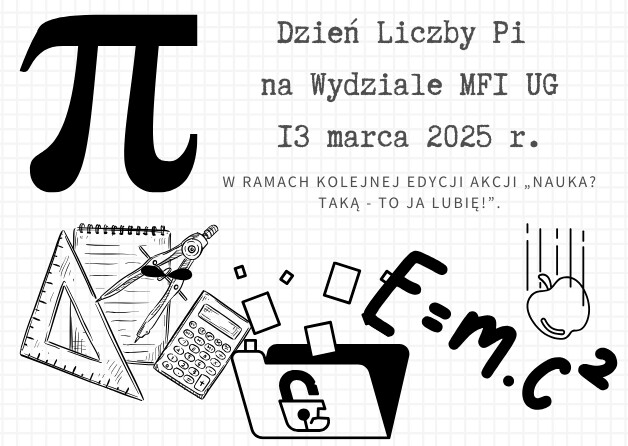 13 marca 2025 roku serdecznie zapraszamy uczniów szkół podstawowych i średnich wraz z nauczycielami na Wydział Matematyki, Fizyki i Informatyki Uniwersytetu Gdańskiego do wzięcia udziału w „Dzień liczby Pi” – cyklu imprez w ramach kolejnej edycji akcji „Nauka? Taką – to ja lubię!”.